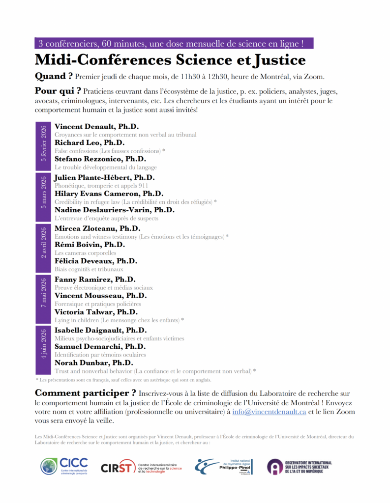 Les midi-conférences Science et Justice présente ont lieu chaque le premier jeudi de chaque mois, de 11h30 à 12h30, heure de Montréal, via Zoom. Les conférenciers sont des chercheurs dont les travaux sont pertinents pour les praticiens œuvrant dans l’écosystème de la justice, p. ex. policiers, analystes, juges, avocats, criminologues, intervenants, etc. Les chercheurs et les étudiants ayant un intérêt pour le comportement humain et la justice sont aussi invités.